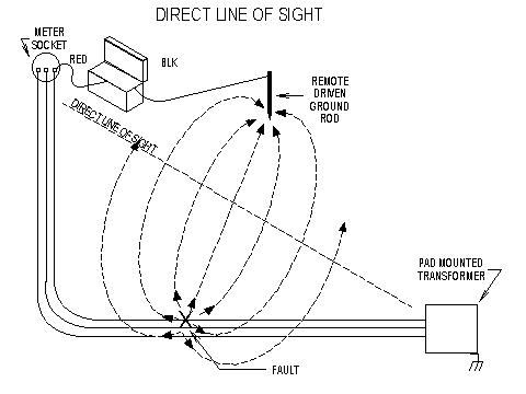| Now that you have identified a faulted cable from either the transformer end or from the meter socket end, you must locate the fault. The Detector "SENS" should be set for receiving a good meter deflection (½ to full scale deflection. Don't peg meter needle off the scale. It may result in Detector meter damage.) from identifying the faulted cable. Establish a straight line of sight from the transformer to the meter socket that you will walk along to locate the fault. This straight line of sight may not necessarily be the cable route, but this is not important. You will, while walking this straight line of sight, pass through the field created by the fault current leaking into the earth. |