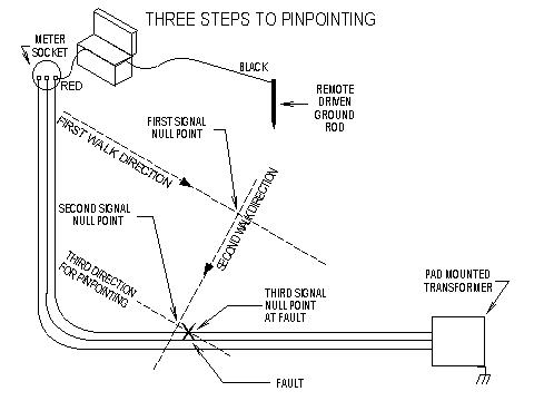 Once you have marked this point on the ground, turn the probes perpendicular to the second path you were walking and moving in a line, zero in on the fault by moving toward the probe that the meter is indicating is closer to the fault. You should be close by the center of the field, so not much adjusting should be necessary to pinpoint the spot. When trying to locate faults under concrete or asphalt, it is generally necessary to wet the surface to increase it's ability to conduct the electrical field occurring at the fault. Three planes to intersect the energy field are all that is necessary to identify the location of a direct buried cable fault. After you have established your first null point and turn perpendicular, it is possible and probable that you will not be able to walk directly along the null point line to the fault location but you will establish a second null point. The third step of turning perpendicular and probing will bring you to the third null point or the actual fault location. The diagram below shows the three steps taken to locate the diagrammed fault. |