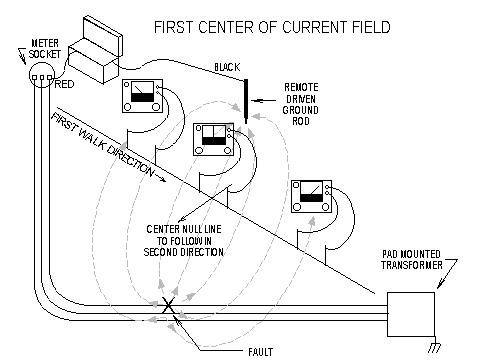 | Now that you have identified a faulted cable from either the transformer end or from the meter socket end, you must locate the fault. The Detector "SENS" should be set for receiving a good meter deflection (½ to full scale deflection. Don't peg meter needle off the scale. It may result in Detector meter damage.) from identifying the faulted cable. Establish a straight line of sight from the transformer to the meter socket that you will walk along to locate the fault. This straight line of sight may not necessarily be the cable route, but this is not important. You will, while walking this straight line of sight, pass through the field created by the fault current leaking into the earth. |