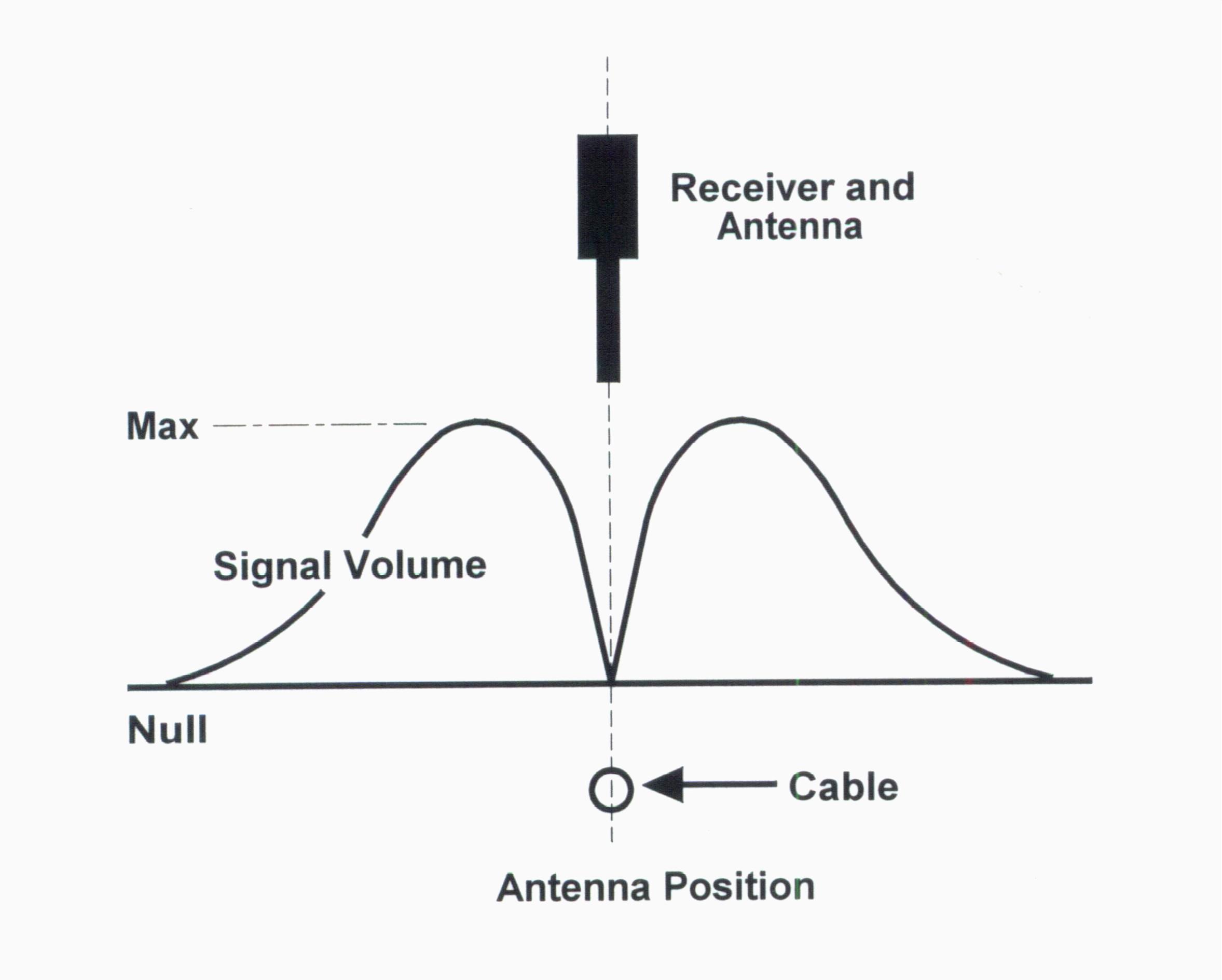![]() The depth of the cable can be determined by holding the antenna at a 45 degree angle to the surface and moving perpendicularly away from the cable route until the signal null point is located. The distance between the location of the cable and the 45 degree null point is equal to the depth of the cable. |